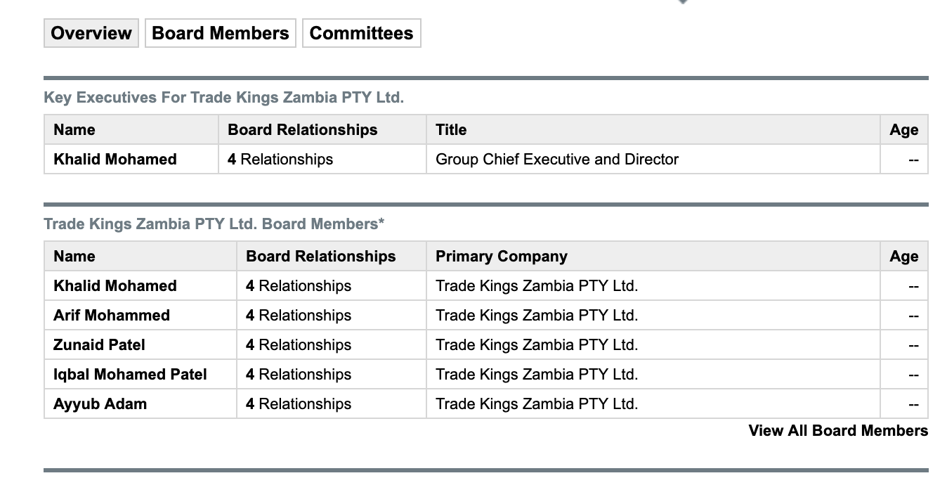 Trade Kings Zambia PTY Ltd. manufactures detergents, soaps, nutritious food products, and sweets and confectionaries. The company offers pastes, powders, and household detergents; confectionaries, such as lollipops, candies, chews and eclairs, and bubble gums; beauty and bath, and laundry soaps; and soy products.